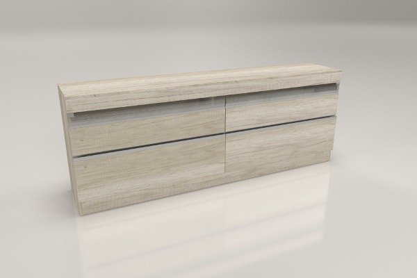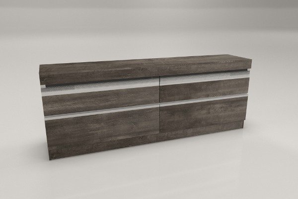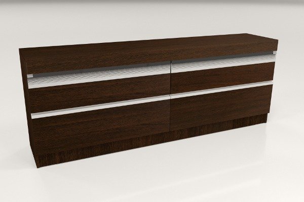 Posee dos puertas volcables con amortiguador neumático, cajones de generosas dimensiones, perfiles de aluminio y detalles de esmerilado en los vidrios.